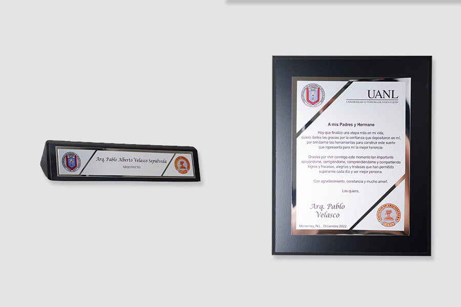 Placas y reconocimientos personalizados para padres y graduados, con diferentes modelos y opciones para elegir, destacando tus logros y los de tus seres queridos.